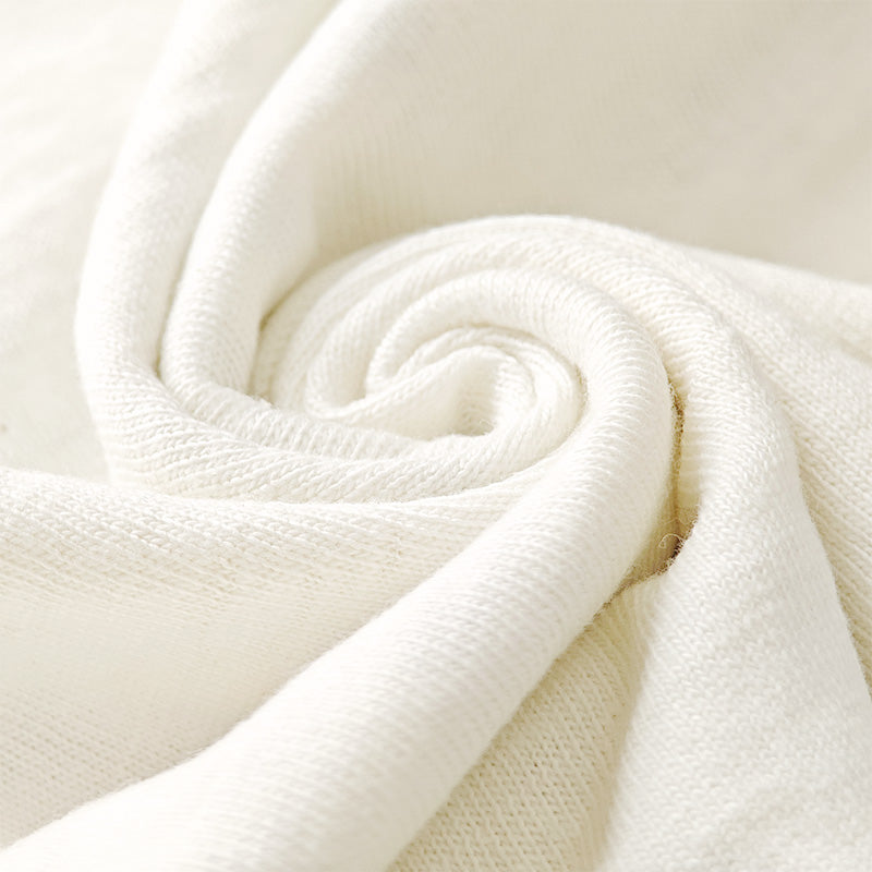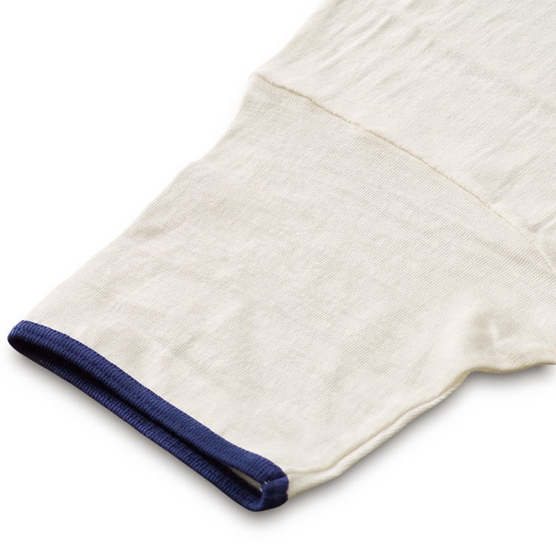 12番のムラ糸で独特の陰影が出るように編まれたこの生地はシャドウボーダーと呼ばれており、無地でありながらうっすらと横段のようなムラが浮かびます。
