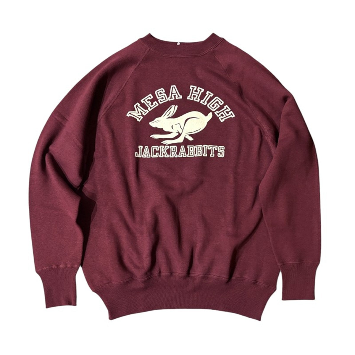 ペナントやスウェットに施されたこれらのフロッキーは、スポーツ観戦や応援など、属する学校や団体の団結のために製造されたものですが、それらは古着となり、年月を経て独特の毛羽立ちや擦れが出て、図柄がなんともいえない味わいに変化しているのが魅力です。ウエアハウスではラグランスウェットのボディーに、これらの新品の状態を再現し、着用と洗濯でヴィンテージのような褪色を楽しんでいただけるフロッキースウェットを製作しました。