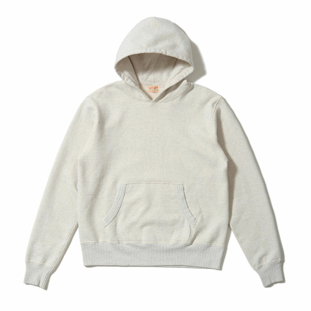 表糸・中糸・裏糸を20/20/7の糸番手で編み立てたヘビーな生地をフラットシーマミシンで仕立てたスウェットパーカ。フード部分は生地を2枚貼り合わせており、カンガルーポケットにパイピングされたリブが特徴的である。身頃は丸胴で、リブには10番手の糸を使った針抜きリブを使用。