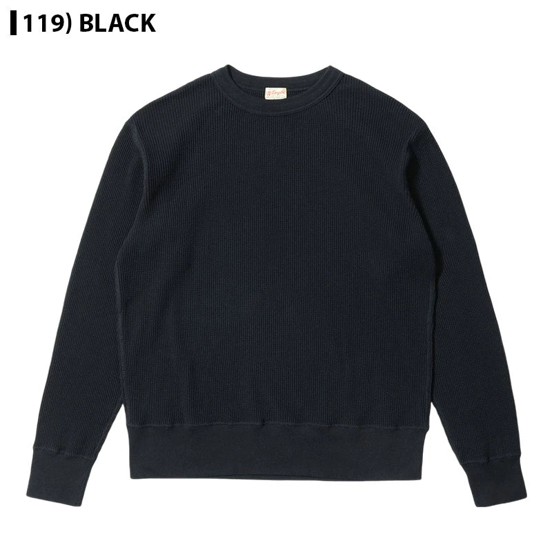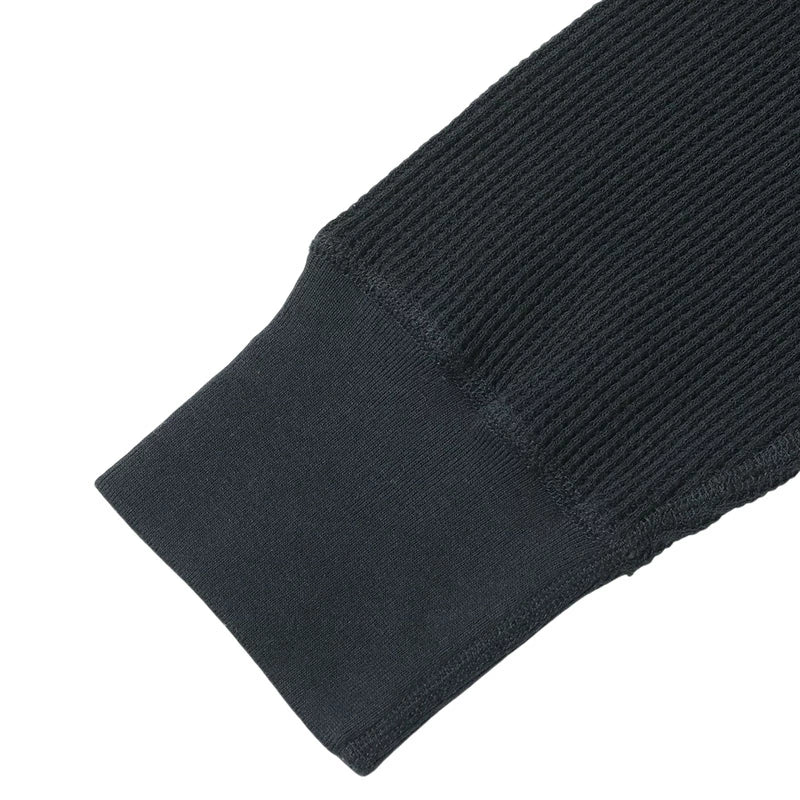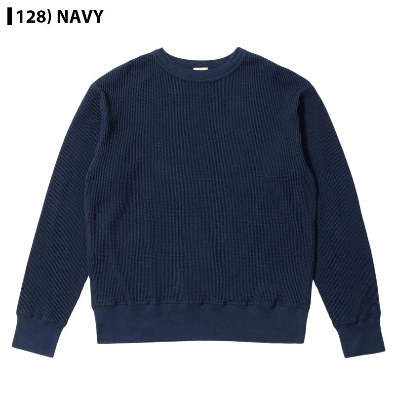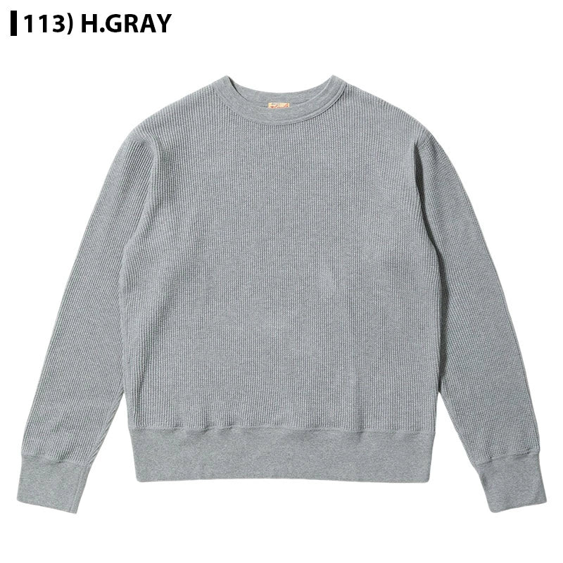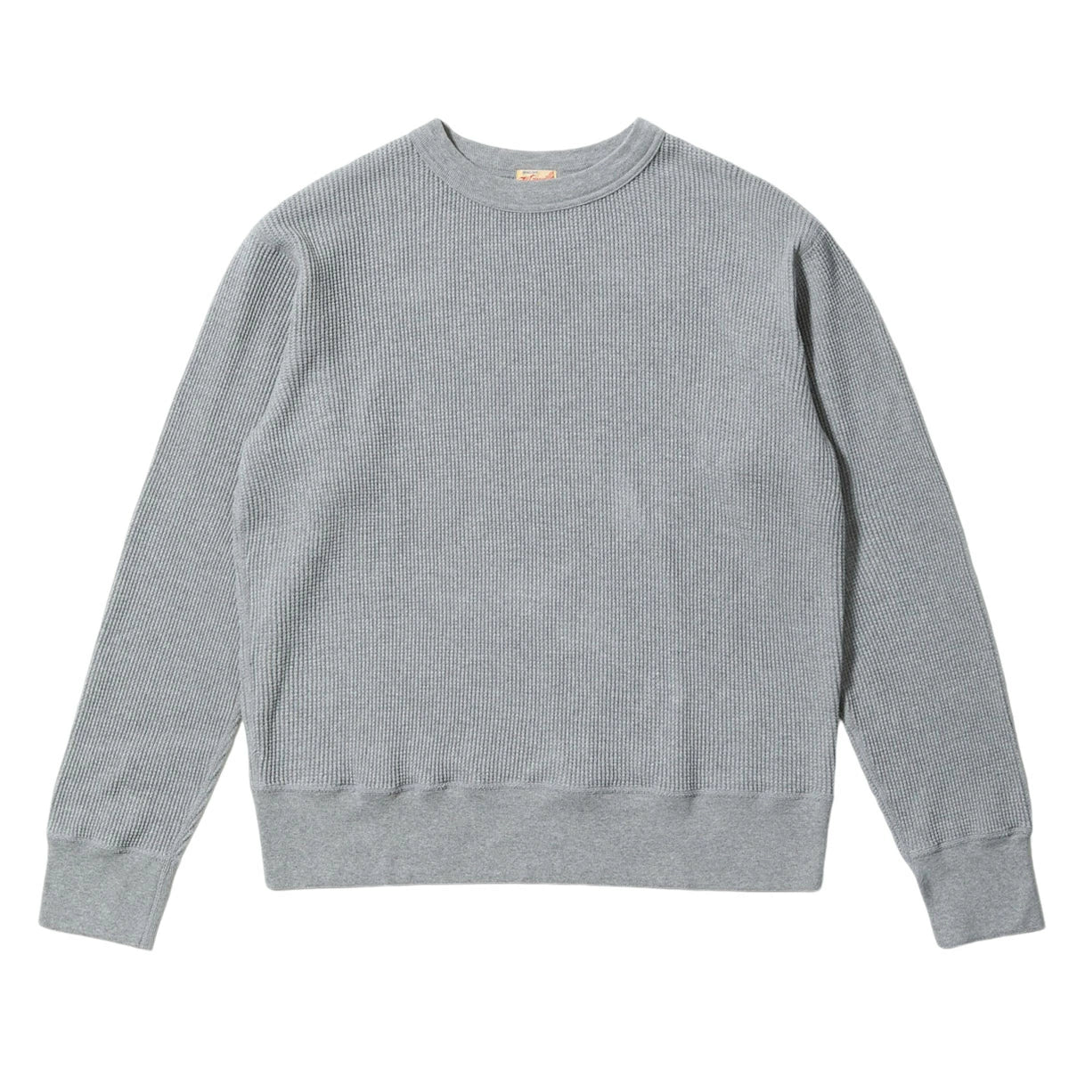 20番手の双糸で編み立てられたヘビーなワッフル生地は、凹凸により保湿性を高める生地である。10番手の糸で編み立てられたリブを裾に縫い付け、スウェットシャツの型に落とし込んでいる。縫製は肌に触れる事を考慮して4本針フラットシーマを用い、単体でも着用できるように作られている。
