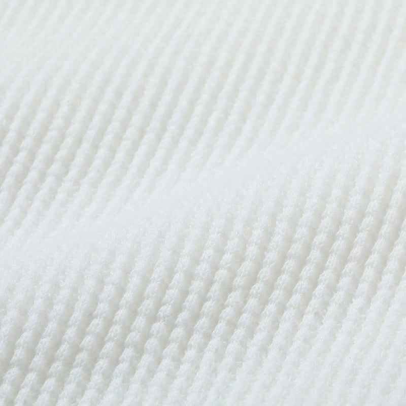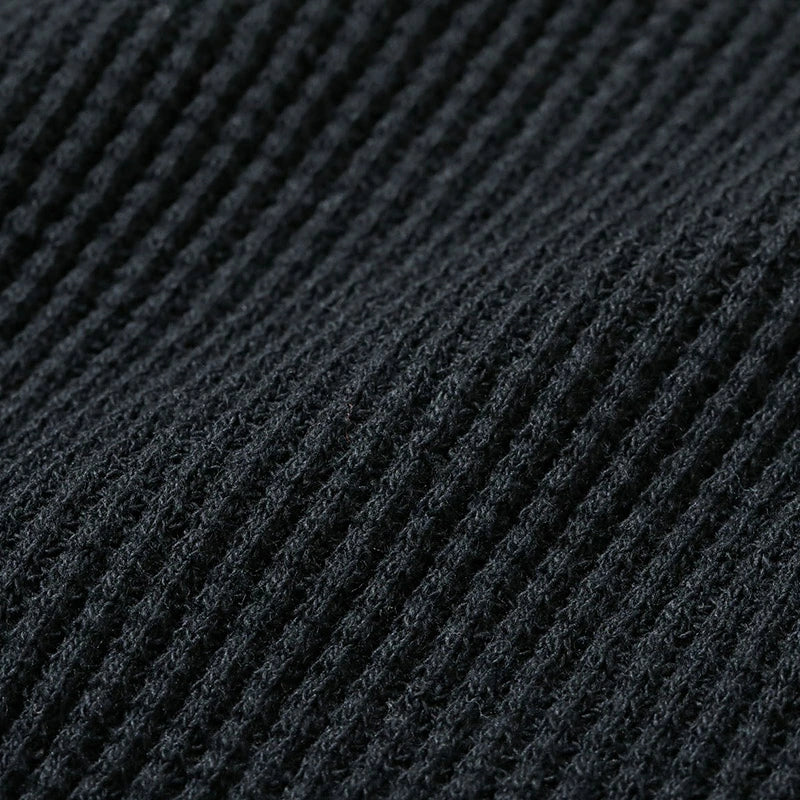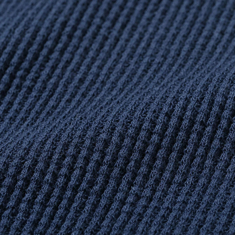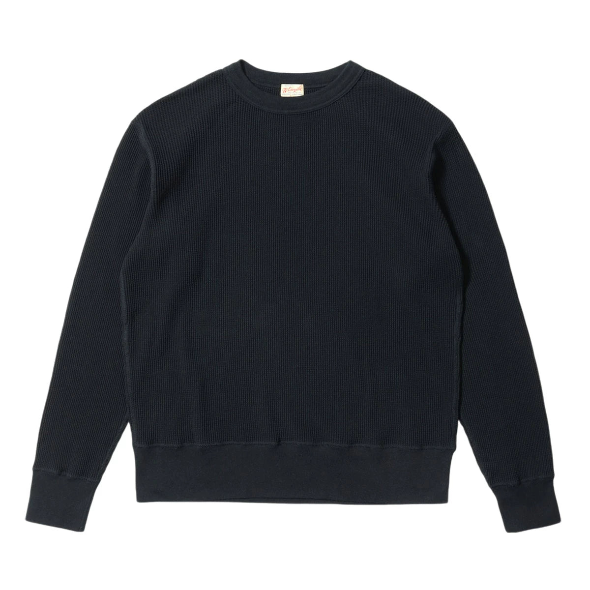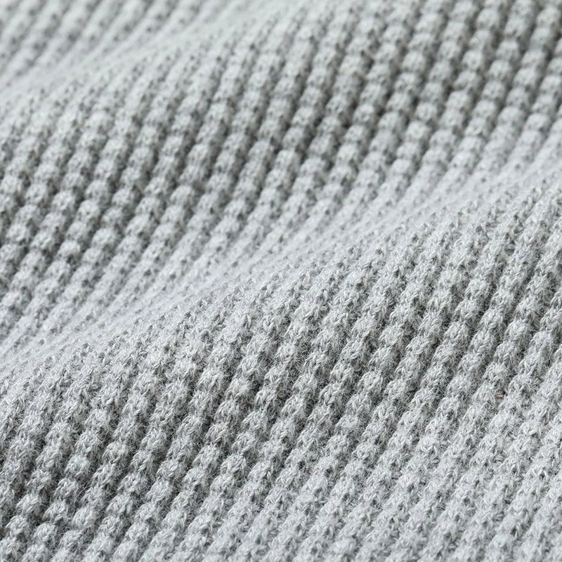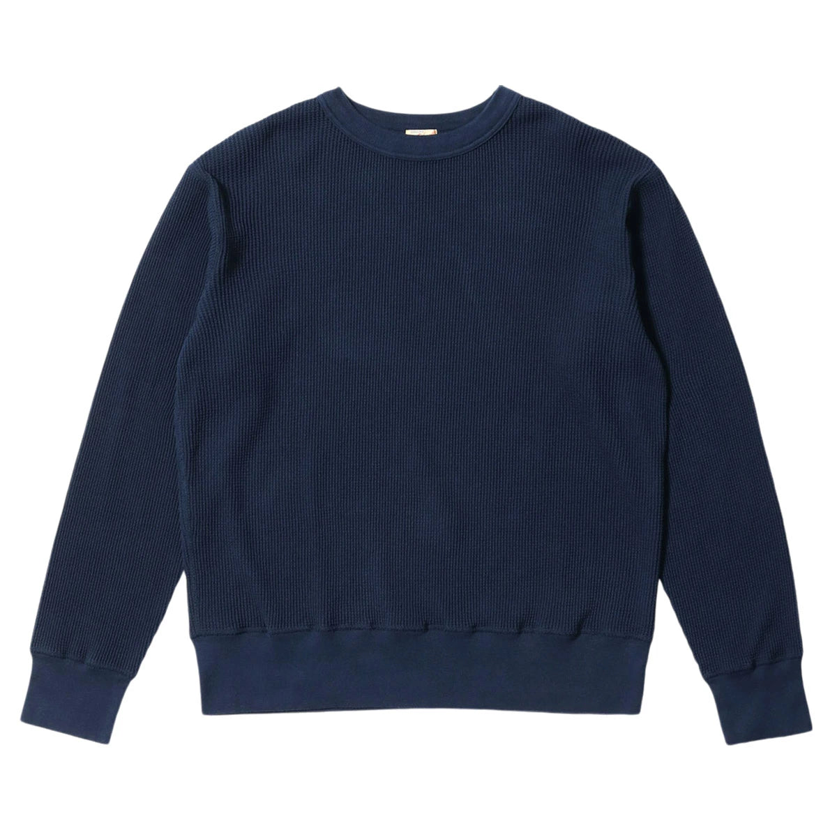 20番手の双糸で編み立てられたヘビーなワッフル生地は、凹凸により保湿性を高める生地である。10番手の糸で編み立てられたリブを裾に縫い付け、スウェットシャツの型に落とし込んでいる。縫製は肌に触れる事を考慮して4本針フラットシーマを用い、単体でも着用できるように作られている。