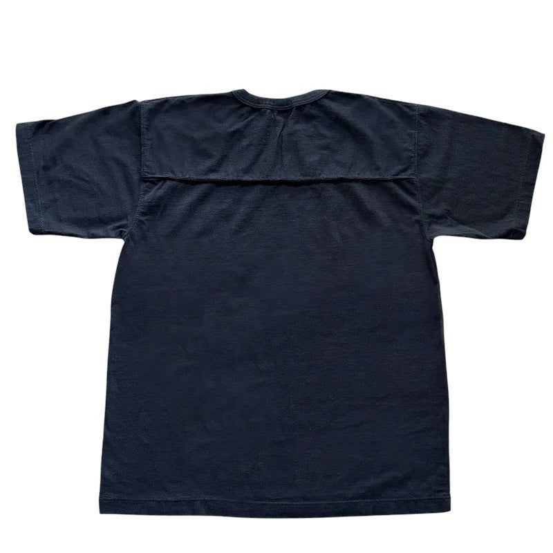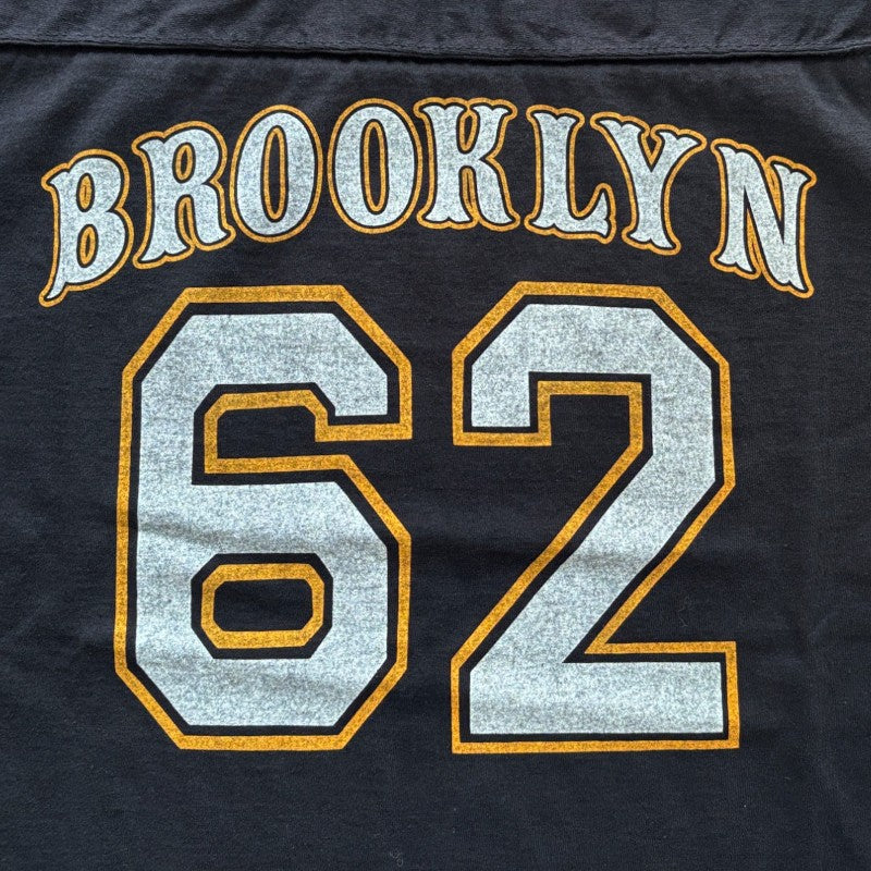 18番手の糸で編み立てられた、胸と背中に切り替えしのあるフットボールTシャツ。 染み込みプリントでナンバリング。少し身幅のある5分袖のオーバーサイズのサイズ感。