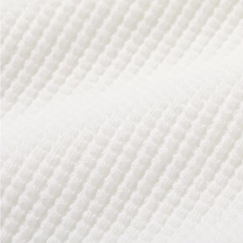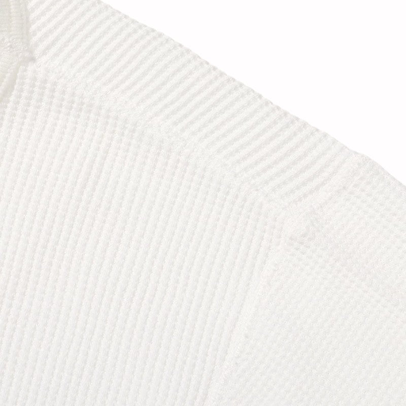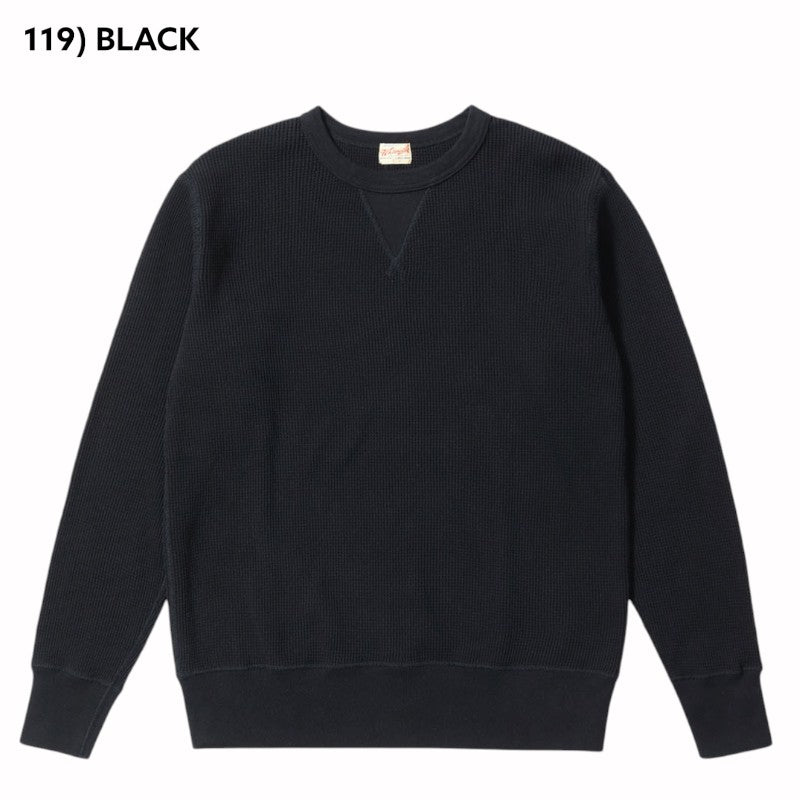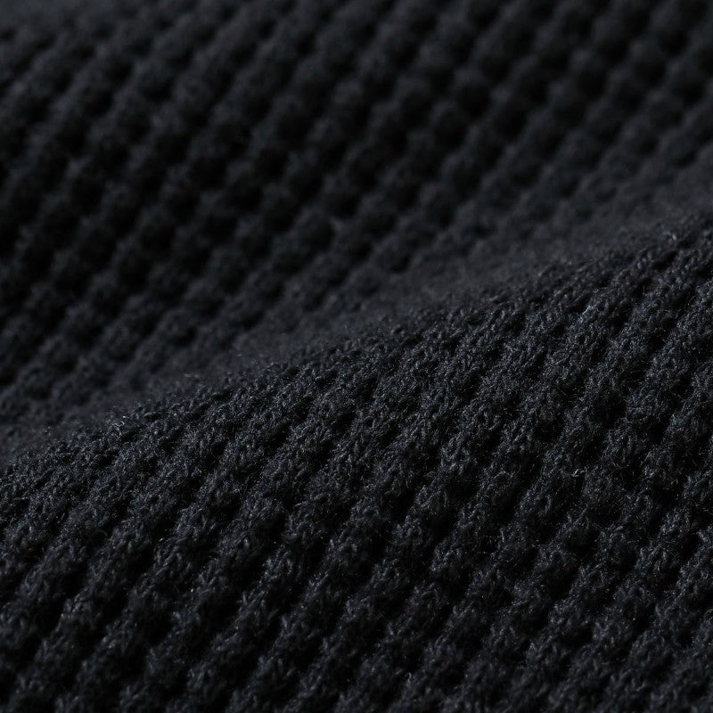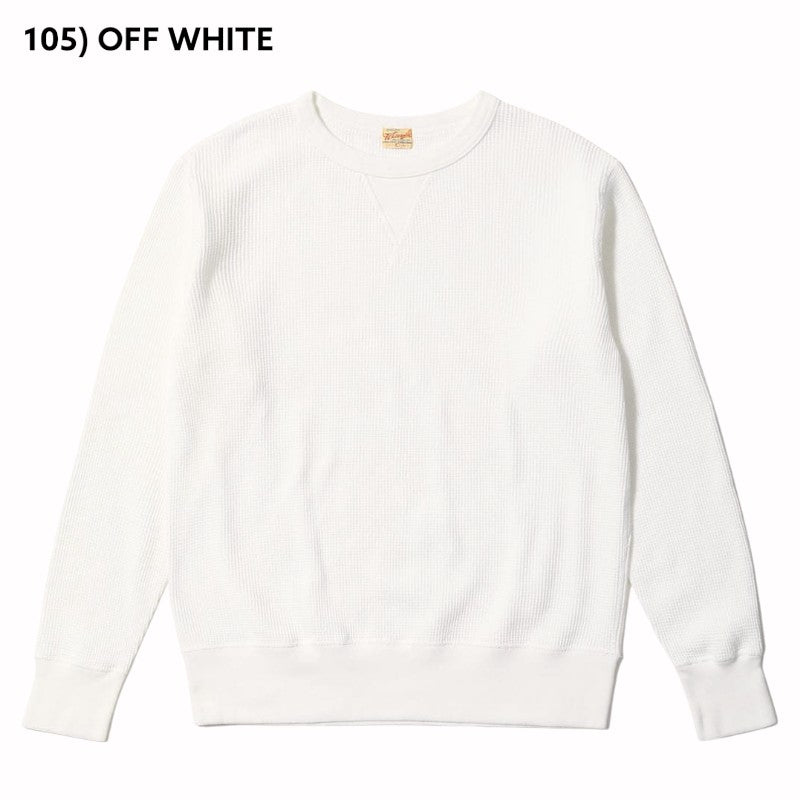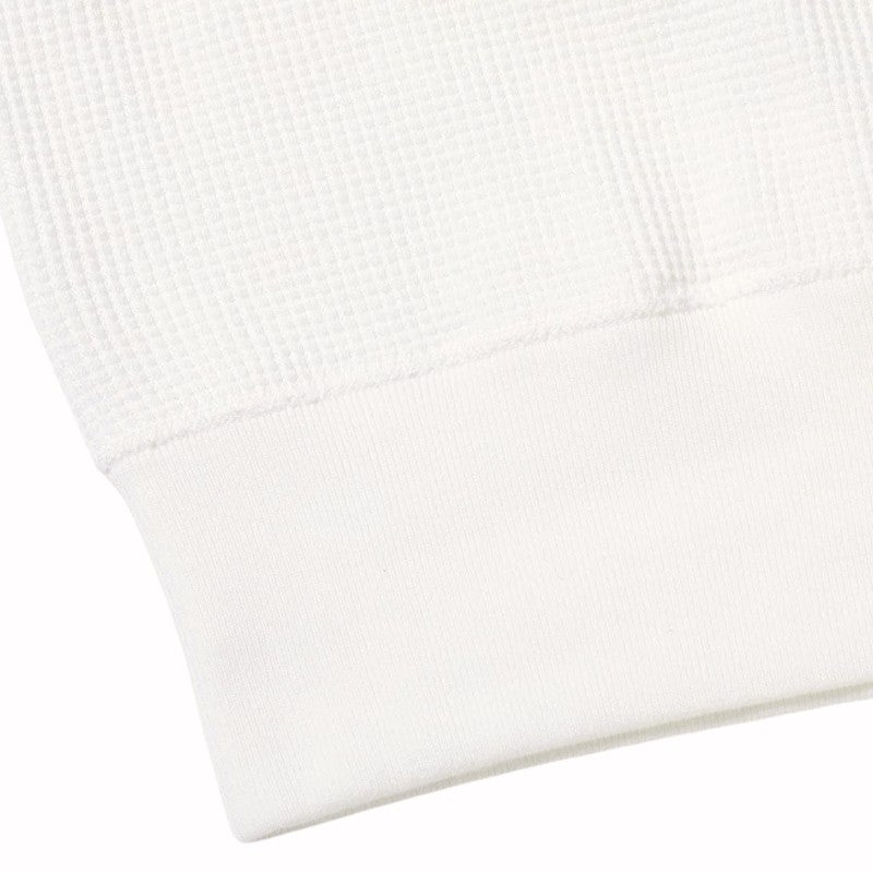 20番手の双糸で編み立てられたヘビーなワッフル生地は、凹凸により保湿性を高める生地である。10番手の糸で編み立てられたリブを裾に縫い付け、スウェットシャツの型に落とし込んでいる。縫製は肌に触れる事を考慮して4本針フラットシーマを用い、単体でも着用できるように作られている。