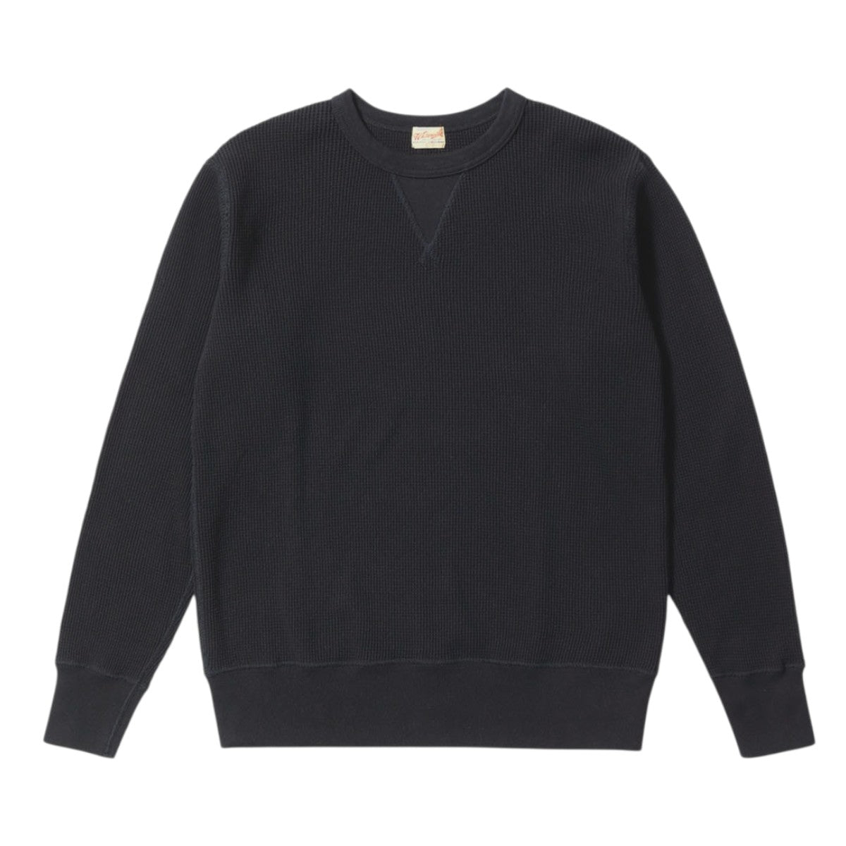 20番手の双糸で編み立てられたヘビーなワッフル生地は、凹凸により保湿性を高める生地である。10番手の糸で編み立てられたリブを裾に縫い付け、スウェットシャツの型に落とし込んでいる。縫製は肌に触れる事を考慮して4本針フラットシーマを用い、単体でも着用できるように作られている。